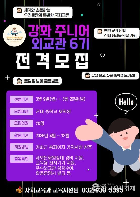 한국시사경제 사회팀 | 강화군은 지역 청소년들에게 국제적 감각과 글로벌 소통 역량을 키울 수 있는 기회를 제공하기 위해 ‘강화 주니어 외교관’ 6기 프로그램 참가자를 오는 3월 29일까지 공개 모집한다.