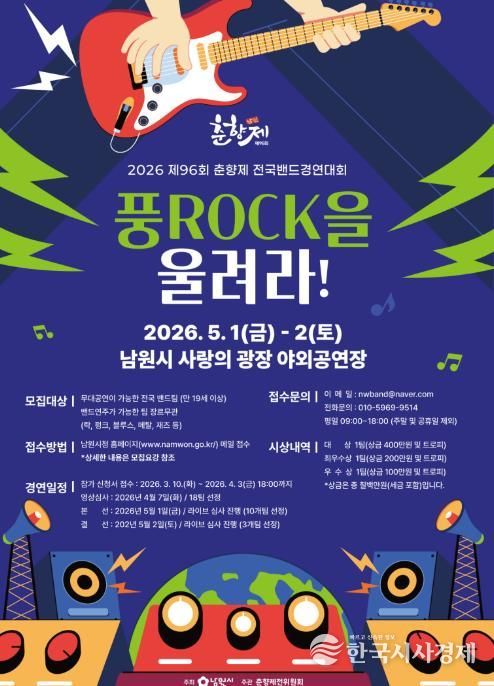 한국시사경제 전북취재본부 | 남원시가 오는 4월 30일부터 5월 6일까지 개최되는 대한민국 대표 전통 축제인 ‘제96회 춘향제’를 맞아, 전국의 실력파 뮤지션들이 한자리에 모이는 밴드 경연대회 ‘풍ROCK을 울려라!’를 개최한다고 밝혔다.