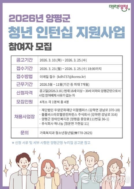 한국시사경제 기동취재팀 | 양평군은 인력이 필요한 관내 사업장과 미취업 청년을 연계하고 사업장에 인건비를 지원하는 ‘2026년 양평군 청년 인턴십 지원 사업’ 참여자를 모집한다고 10일 밝혔다.