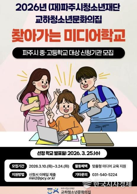 한국시사경제 경기북부취재본부 | (재)파주시청소년재단 교하청소년문화의집은 파주시 청소년의 미디어 이해력 향상과 디지털 역량 강화를 위해 ‘2026년 찾아가는 미디어학교’ 프로그램에 참여할 중·고등학교를 모집한다고 밝혔다.
