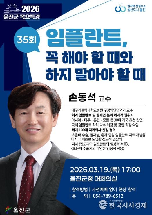한국시사경제 권충언 기자 | 울진군은 오는 3월 19일 오후 5시 울진군청 대회의실에서 손동석 교수를 초청해‘임플란트, 꼭 해야 할 때와 하지 말아야 할 때’를 주제로 제35회이자 2026년 첫 목요특강을 개최한다.