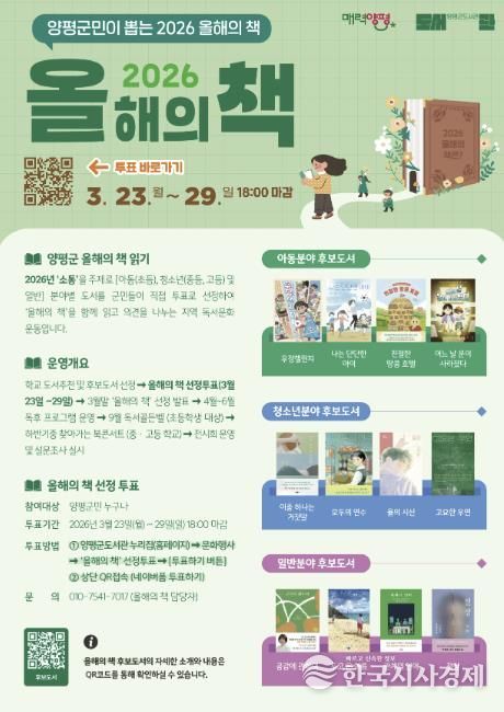 한국시사경제 기동취재팀 | 양평군은 지역 주민과 함께 한 권의 책을 읽고 공감하는 독서문화 확산을 위해 2026년 ‘올해의 책’ 후보 도서를 선정하고 군민 투표를 실시한다고 밝혔다.