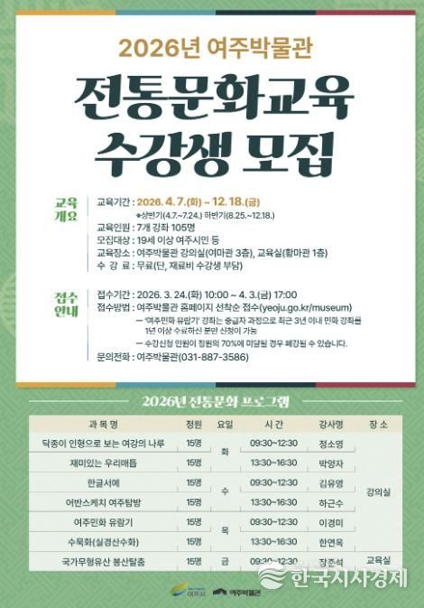 한국시사경제 기동취재팀 | 여주시 여주박물관은 오는 3월 24일부터 ‘2026년 전통문화교육’ 수강생을 모집한다.