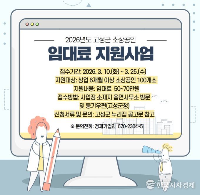 임대료 지원요건은 고성군에 6개월 이상 사업장을 임차해 운영 중인 소상공으로서, 월 임대료 10만원 이상 사업장을 대상으로 신청서류를 접수받아 적격 심사를 거쳐 선정할 계획이며, 지원금은 상반기 내 지급될 예정이다.