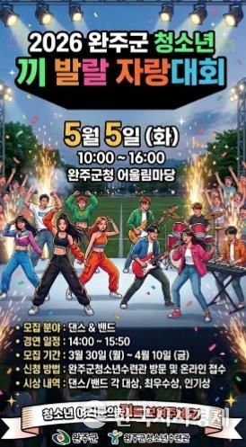 한국시사경제 김숙영 기자 | 완주군이 오는 5월 5일 제104회 어린이날에 아동과 청소년들이 주인공이 되어 숨겨진 재능과 에너지를 마음껏 발산할 수 있는 ‘2026 완주군 아동·청소년 끼 발랄 자랑대회’를 개최한다.