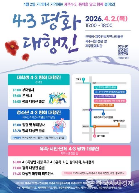 이번 대행진은 같은 날 저녁 제주문예회관에서 열리는 4·3 전야제와 연계해 진행된다. 참가 신청은 행사 포스터의 큐알(QR)코드 접속 또는 이메일을 통해 할 수 있으며, 문의는 ㈔제주4·3기념사업위원회로 하면 된다.