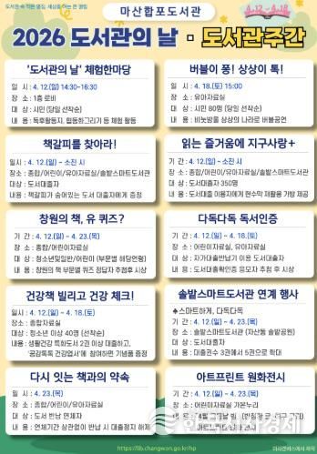 한국시사경제 노승선 기자 | 마산합포도서관에서는 ‘도서관의 날’과 ‘도서관주간’을 맞아 지역 주민의 독서문화 확산과 도서관 이용 활성화를 위해 다양한 참여형 프로그램을 운영한다.