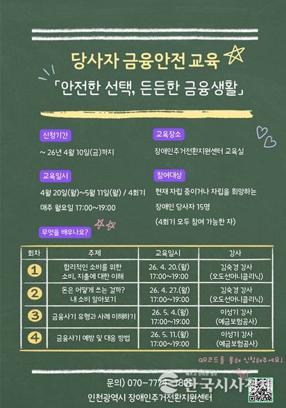한국시사경제 문화팀 | 인천시사회서비스원 소속 인천시장애인주거전환지원센터는 당사자 금융 안전교육 ‘안전한 선택, 든든한 금융 생활’ 참가자를 모집한다고 6일 밝혔다.