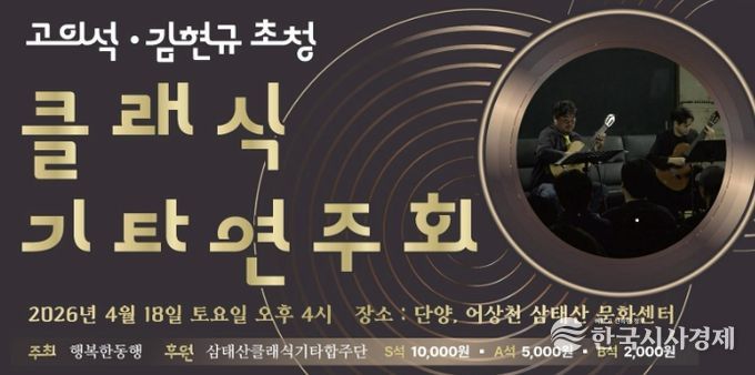한국시사경제 충북취재본부 | 단양군 어상천 지역에서 활동하는 삼태산 클래식기타 합주단은 공연기획단체 행복한 동행(대표 홍원의)과 함께 오는 18일 오후 4시 어상천 삼태산문화센터에서 ‘고의석·김현규 초청 클래식기타 연주회’를 개최한다.