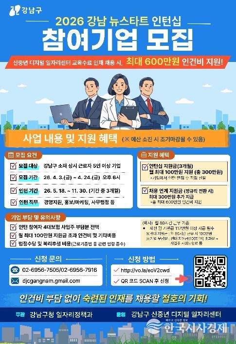 한국시사경제 이정이 기자 | 꿈이 모이는 도시, 미래를 그리는 강남구가 경력과 전문성을 갖춘 신중년의 재취업을 돕고 기업의 인력난을 덜기 위해 ‘2026년 강남 뉴스타트 인턴십’ 참여기업을 모집한다. 기업이 40~64세 신중년 강남구민을 신규 채용하면 인턴 기간과 계속 고용 여부에 따라 1인당 최대 600만 원의 인건비를 지원한다.