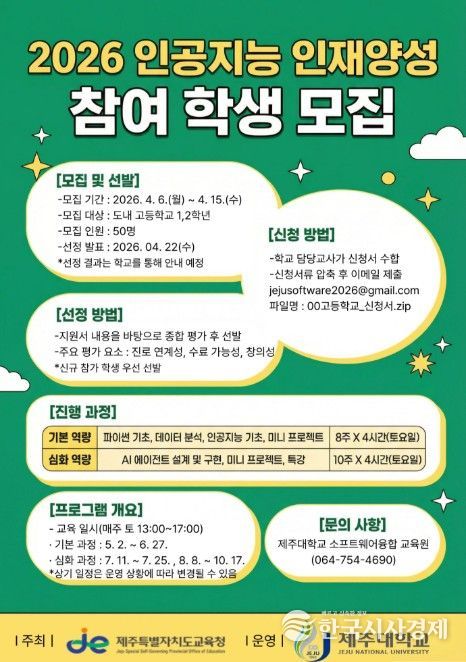 한국시사경제 노승선 기자 | 제주특별자치도교육청은 7일 미래 인공지능 사회를 선도할 이공계 핵심 인재 양성을 위해 도내 고등학교 1·2학년 학생 50명을 대상으로 ‘2026년 인공지능(AI) 인재 양성 프로그램’을 운영한다고 밝혔다.
