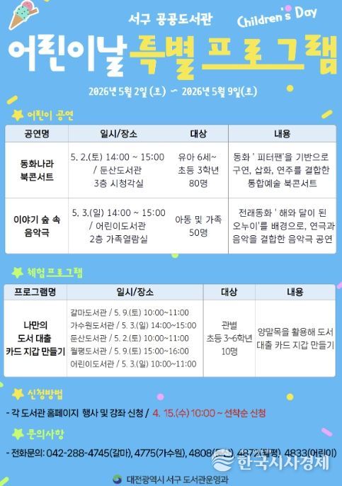 한국시사경제 대전취재본부 | 대전 서구 갈마·가수원·둔산·월평·어린이도서관은 내달 2일부터‘어린이날 특별 프로그램’을 운영한다.