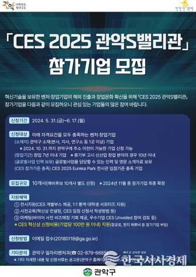 한국시사경제 이정이 기자 | 관악구는 혁신기술을 보유한 벤처·창업기업의 해외 진출과 창업문화 확산을 위해 2024년에 이어 '2025년 국제전자제품박람회(CES 2025)' 참가기업을 모집한다.