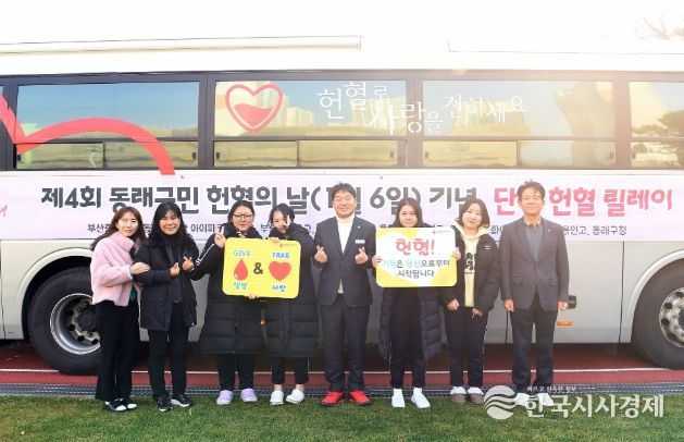 지난 26일 동래구민 단체 헌혈 릴레이 12회차에 대명여고 학생과 교직원 105명이 참여하여 82명 헌혈 기부에 성공하고, 27일 13회차에 용인고 학생 및 교직원 163명이 참여하여 159명 헌혈 기부에 성공했다고 밝혔다.
