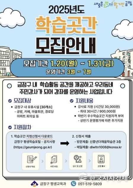 한국시사경제 부산취재본부 | 부산 금정구는 구민의 근거리 학습권 보장과 평생학습 기회 확대를 위해 지역 내 유휴시설을 대상으로 1월 20일부터 1월 31일까지 학습 곳간을 모집한다.