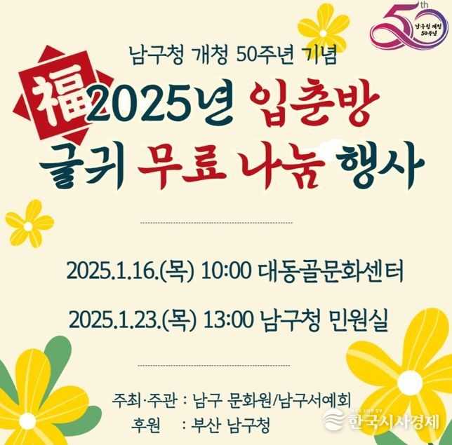 남구청 개청 50주년을 맞아 구민과 함께 구정 50년의 의미를 돌아보며 새롭게 도약하는 남구를 재조명하기 위한 기념사업을 추진하고 있는데, 그 일환으로 구민 모두와 가정에 복을 나누어 주기 위해 입춘에 벽이나 문짝, 문지방에 써 붙이는 글인‘입춘방’나눔 행사를 가지게 된 것이다.