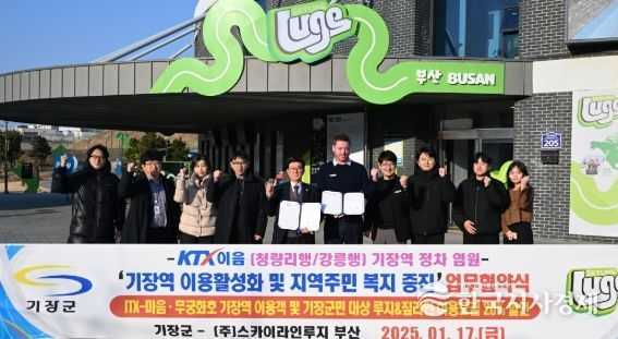 한국시사경제 부산취재본부 | 기장군은 17일 스카이라인루지부산(지사장 딘 존슨)과 ‘기장역 이용활성화 및 지역주민 복지증진을 위한 업무협약’을 체결하면서, 올해 KTX-이음 기장역 유치 활동에 첫 신호탄을 쏘았다고 밝혔다.