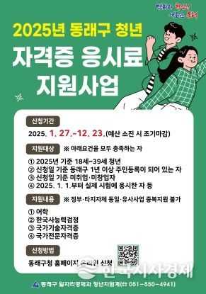 한국시사경제 부산취재본부 | 부산 동래구는 오는 27일부터 관내 미취업·미창업 청년들의 취업 능력 개발을 지원하는 2025 동래구 청년 자격증 응시료 지원사업을 시행한다고 밝혔다.