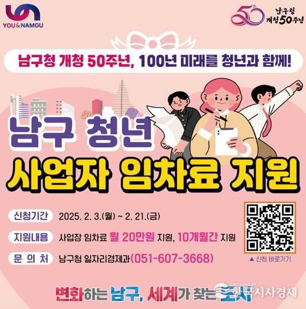 한국시사경제 부산취재본부 | 부산 남구청에서는 개청50주년을 맞이하는 남구의 지역 청년들의 미래를 응원하기 위하여 남구에 거주하는 청년 사업자를 대상으로 ‘청년 사업자 임차료 지원사업’을 시행한다고 밝혔다.