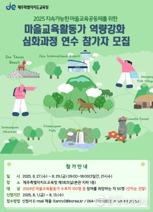 한국시사경제 한장선 객원기자 | 제주특별자치도교육청은 오는 27일부터 29일까지 3일간 교육청 제1회의실에서 마을교육활동가 30여 명을 대상으로 ‘2025 마을교육활동가 역량강화 심화과정 연수’를 운영한다.