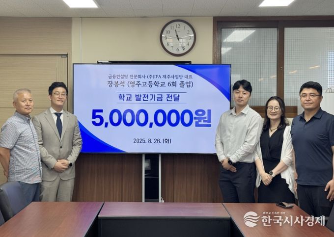 한국시사경제 한장선 객원기자 | 제주도교육청 영주고등학교는 26일 장봉석 ㈜아이에프에이(iFA) 제주사업단 대표(6회 졸업생)가 모교를 방문해 지난해에 이어 학교발전기금 500만원을 기탁했다고 밝혔다.