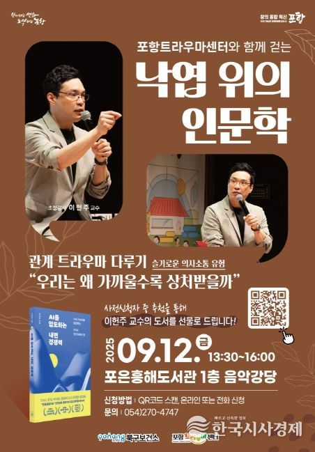 한국시사경제 한장선 객원기자 | 포항트라우마센터가 준비한 특별한 가을 인문학 강좌 ‘낙엽 위의 인문학’이 오는 9월 12일 오후 1시 30분, 포은흥해도서관 대강당에서 열린다.