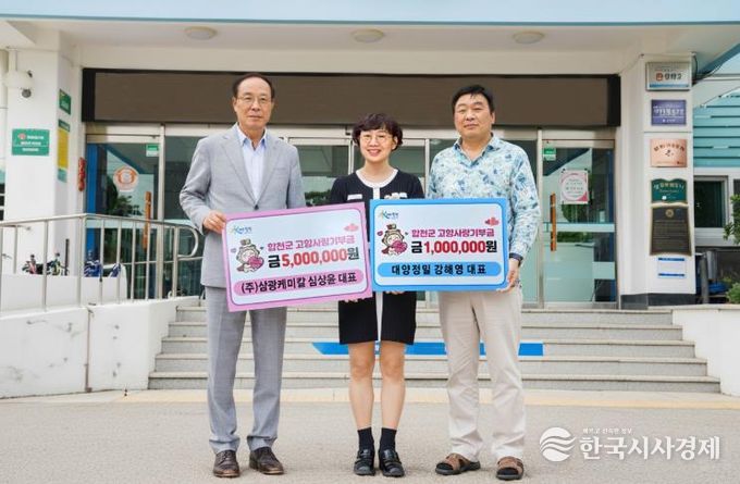 한국시사경제 윤경수 기자 | 합천군은 8월 29일 기획예산담당관실에서 ㈜삼광케미칼(부산광역시 소재) 심상윤 대표가 고향사랑기부금 500만원을, ㈜대양정밀(경남 김해시 소재) 강해영 대표가 고향사랑기부금 100만원을 각각 전달했다고 밝혔다.
