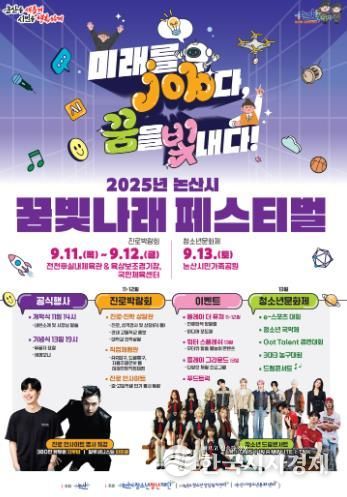한국시사경제 오영주 기자 | 논산시는 11일부터 13일까지 3일간, 청소년의 성장과 발전을 지원하고 진로 탐색과 문화 교류의 장을 마련하기 위한 ‘2025 논산시 청소년 꿈빛나래 페스티벌’을 개최한다.