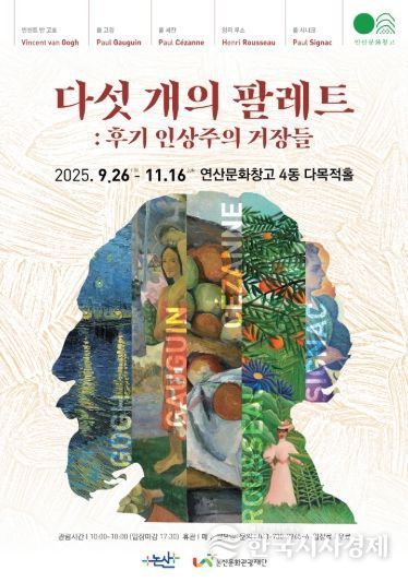 한국시사경제 오영주 기자 | (재)논산문화관광재단은 오는 9월 26일부터 11월 16일까지 연산문화창고 4동 다목적홀에서 '다섯 개의 팔레트 : 후기 인상주의 거장들' 전시를 개최한다고 밝혔다.