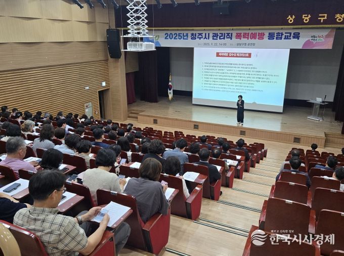 한국시사경제 오영주 기자 | 청주시는 22일 상당구청 대공연장에서 시 기관장과 고위직 공무원 185명을 대상으로 직장 내 4대 폭력(성희롱,성매매,성폭력,가정폭력) 예방 통합교육을 실시했다.