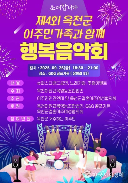 한국시사경제 오영주 기자 | 옥천군 묘목산업을 책임지는 옥천이원묘목영농조합법인(대표 김영식)이 오는 26일 오후 6시 30분부터 9시까지 옥천군 내 G&G골프가든에서 옥천군 이주민 가족과 함께하는‘제4회 옥천군 이주민 가족과 함께 행복음악회’를 개최한다.