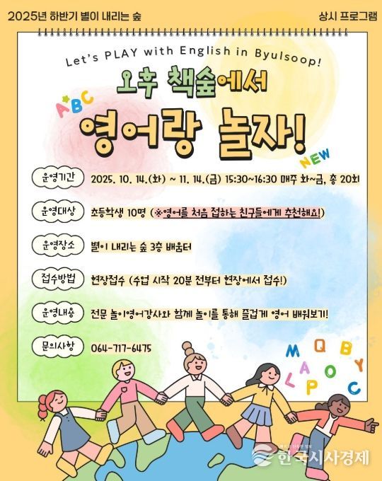 한국시사경제 한장선 객원기자 | 제주도교육청 제주도서관은 10월 14일부터 오는 11월 14일까지 한 달간 ‘별이 내리는 숲’ 3층 배움터에서 초등학생 10명을 대상으로 놀이 중심 영어 교육 프로그램 ‘오후 책숲에서 영어랑 놀자!’를 총 20회 운영한다.