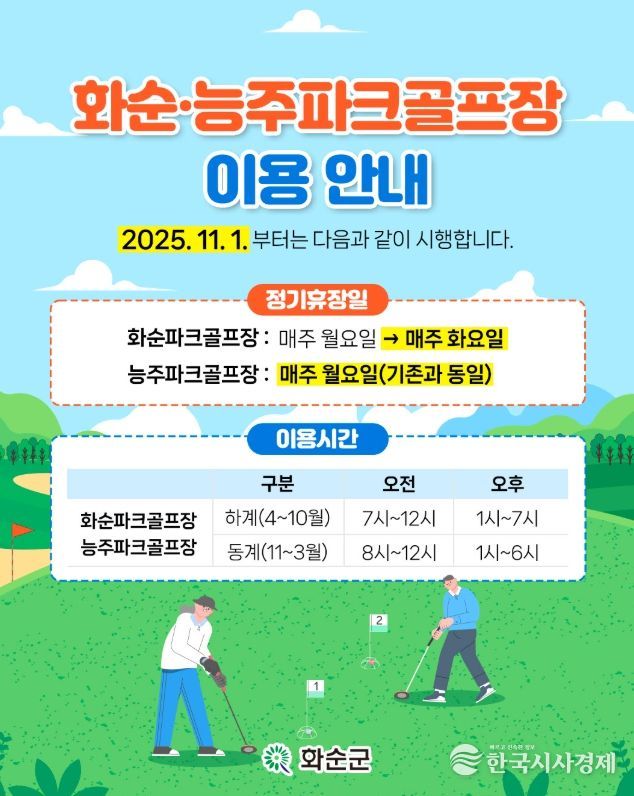 화순군은 화순파크골프장과 능주파크골프장이 매주 월요일 동시에 휴장하던 방식을 변경한다. 화순파크골프장은 매주 화요일에 휴장하고, 능주파크골프장은 기존대로 매주 월요일 휴장한다.