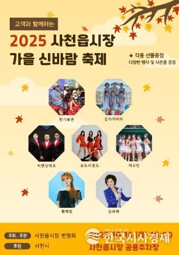 한국시사경제 윤광희 기자 | 사천시는 오는 16일 사천읍시장 공영주차장(특설무대)에서 ‘제15회 사천읍시장 가을 신바람 축제’를 개최한다고 14일 밝혔다.