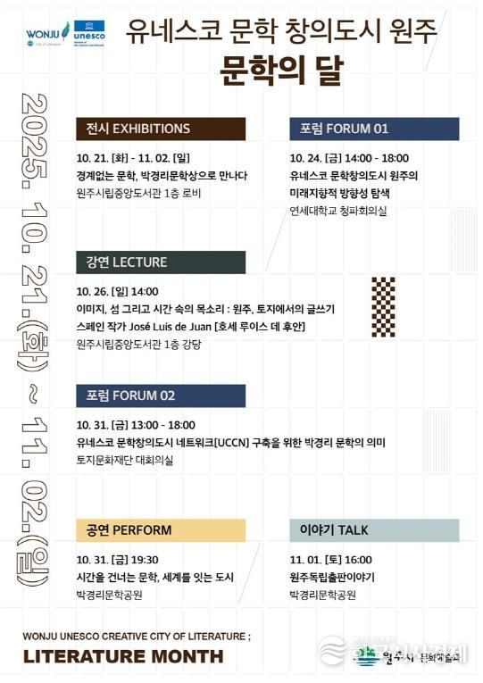 한국시사경제 이정이 기자 | ‘유네스코 문학 창의도시 원주’가 오는 10월 21일부터 11월 2일까지 ‘시간을 건너는 문학, 세계를 잇는 도시’를 기치로'2025년 원주 문학의 달'행사를 개최한다.