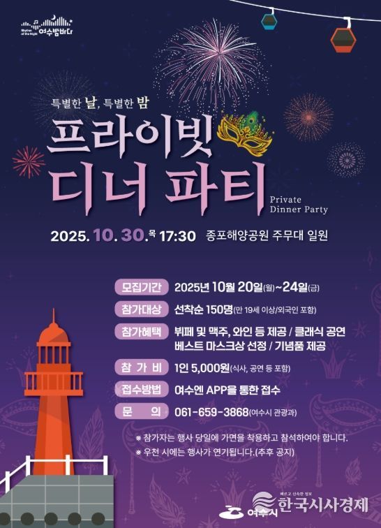 한국시사경제 전남취재본부 | 여수시는 오는 10월 30일 종포해양공원 주무대 일원에서 ‘특별한 날, 특별한 밤 프라이빗 디너 파티’를 개최한다.