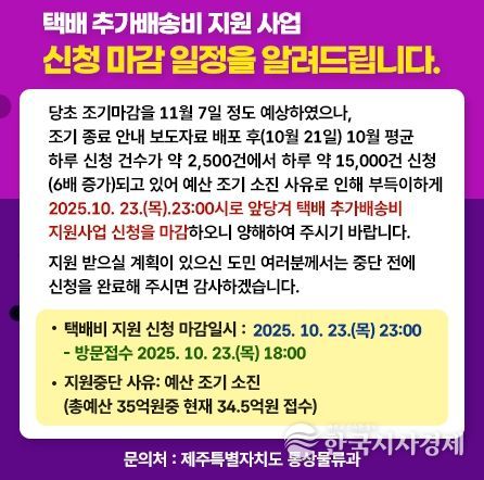 한국시사경제 노승선 기자 | 제주특별자치도는 택배 추가배송비 지원 사업이 당초 11월 7일 종료 예정이었으나, 신청 급증으로 10월 23일 오후 11시(방문 접수 오후 6시)에 조기 종료된다고 밝혔다.