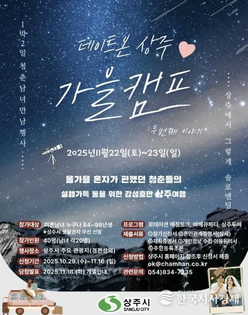 한국시사경제 경북취재본부 | 상주시는 다음달 22일~23일 1박2일간 관내 주요 관광지 일원에서 미혼남녀 만남사업 “데이트 온 상주-시즌2 가을캠프”를 개최한다고 밝혔다.