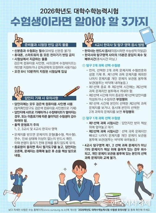 한국시사경제 세종취재분부 | 세종특별자치시교육청은 11월 13일에 실시되는 2026학년도 대학수학능력시험을 수험생들이 안정적으로 치를 수 있도록 ‘수험생 유의사항’을 안내했다.