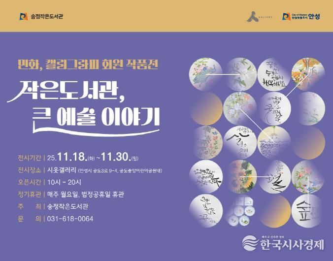 한국시사경제 경기취재본부 | 안성천 공도 작은미술관 시옷갤러리에서는 오는 11월 18일(화)부터 30일(일)까 지 송정작은도서관의 지역 주민으로 구성된 민화 캘리그라피 회원들의 작품을 모은 전시회 ‘작은도서관, 큰 예술 이야기’가 열린다.