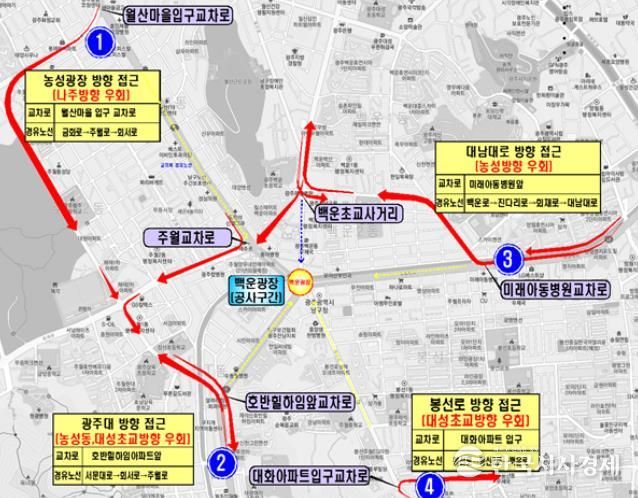 통제 구간 차량 우회도로는 ▲농성교차로에서 백운광장 방향 → 월산마을 입구 교차로에서 양궁장 방향 ▲광주대에서 백운광장 → 호반힐하임 교차로에서 양궁장 방향 ▲남광주(봉선·방림)에서 백운광장 → 미래아동병원 교차로에서 기독병원(수피아여고) 방향 ▲봉선동에서 백운광장 방향 → 대화아파트 입구 교차로에서 봉선중앙로(봉선초교) 방향 등이다.