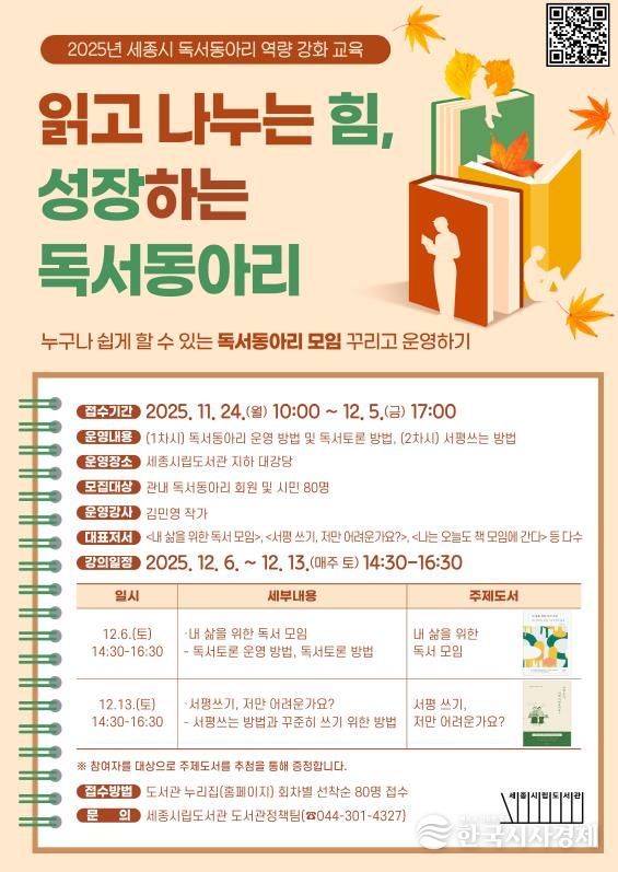 시립도서관 관계자는 “독서동아리는 시민 스스로 만들어가는 지역 독서문화의 기반”이라며 “교육을 통해 세종시 독서동아리가 더욱 성장하는 계기가 되길 바란다”고 말했다.
