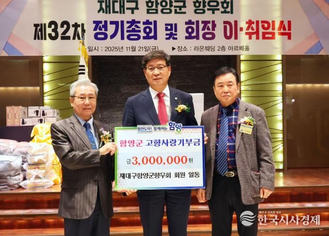 특히 이날 행사에서는 노상진 취임 회장이 고향 후배들의 꿈을 응원하며 장학금 200만 원을 (재)함양군장학회에 기탁했으며, 전국의 함양 향우들이 자발적으로 참여하는 ‘함양 고향사랑 십시일반 기부 챌린지’의 하나로 재대구 향우들이 마음을 모아 300만 원의 고향사랑기부금을 함양군에 전달하며 고향에 대한 깊은 사랑을 전했다.