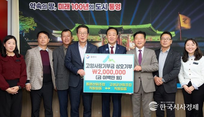 한국시사경제 경남취재본부 | 통영시는 지역 간 상생발전을 위해 통영산림조합(조합장 차형재) 직원 20명과 고성군산림조합(조합장 황영국) 직원 20명이 2년 연속 고향사랑기부제 상호교차 기부에 동참했다고 25일 밝혔다.