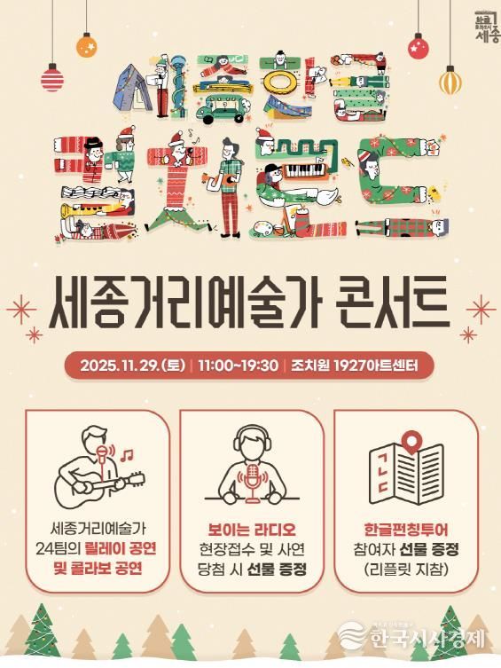 한국시사경제 세종취재분부 | 세종시문화관광재단은 오는 11월 29일 오전 11시, 조치원읍 1927아트센터에서 ‘세종거리예술가 콘서트’를 개최한다.