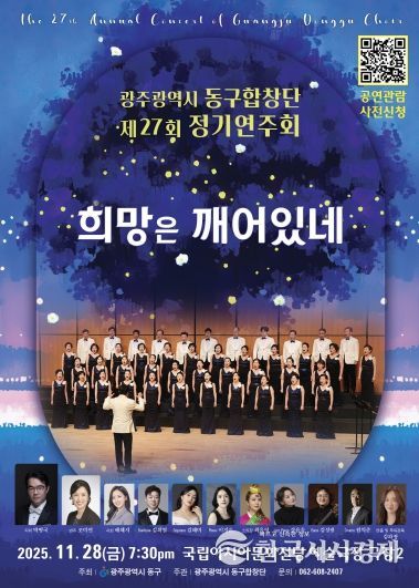 한국시사경제 광주취재본부 | 광주 동구는 동구합창단이 오는 28일 오후 7시 30분 국립아시아문화전당 예술극장 극장2에서 ‘제27회 정기연주회 희망은 깨어있네(Hope is Awake)’를 개최한다고 밝혔다.