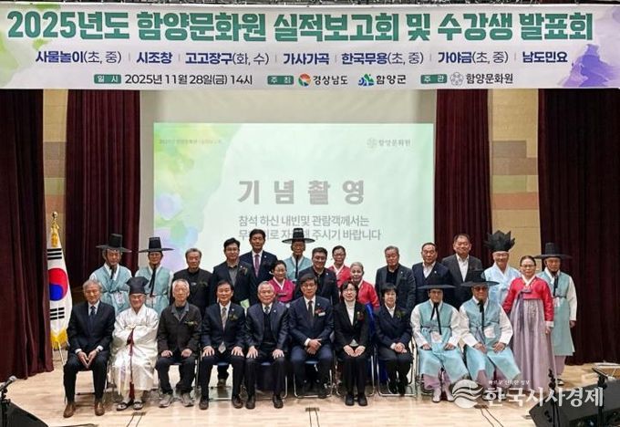 한국시사경제 경남취재본부 | 함양문화원은 11월 28일 경상남도와 함양군의 후원으로 ‘2025 문화원 실적보고회 및 수강생 발표회·작품전시회’를 성황리에 마쳤다고 밝혔다.