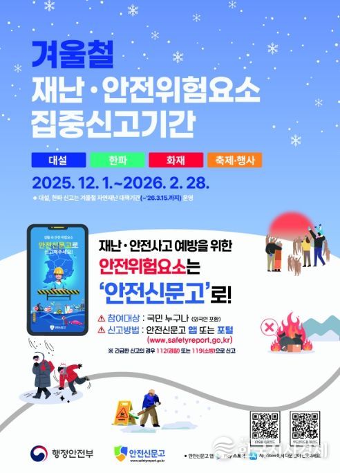 한국시사경제 사회팀 | 행정안전부는 올해 12월부터 내년 2월까지 ‘겨울철 재난안전 위험요소 집중신고기간’을 운영한다.