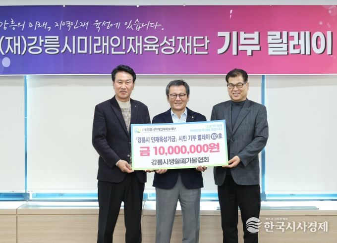 한국시사경제 권충언 기자 | 강릉시생활폐기물협회와 소나무앤컴퍼니(대표 강세민)는 1일, (재)강릉시미래인재육성재단에 각각 1천만 원과 1백만 원을 기탁한다.