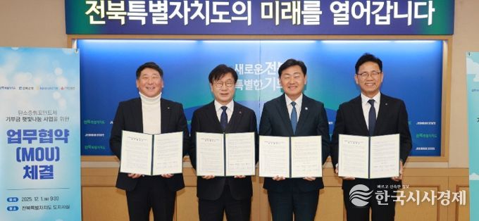 전북도는 1일 도청에서 전북은행, 농협은행, 전북사회복지공동모금회와 ‘탄소중립 햇빛나눔 업무협약’을 체결하고, 기후위기 취약계층을 위한 새로운 에너지 복지 모델을 선보였다. 이날 협약식에는 김관영 도지사, 오현곤 전북은행 부은행장, 김성훈 농협은행 전북본부장, 한명규 전북사회복지공동모금회장이 참석해 사업 취지와 향후 협력 방향을 공유했다.